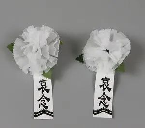 黑紗:一般為親屬佩戴,通常佩戴在手臂上,以表示對逝者的哀悼。其佩戴位置根據逝者性別有所不同,男左女右,即如果逝者是男性,則黑紗戴在左手臂上;如果逝者是女性,則黑紗戴在右手臂上。佩戴時間為簽到時戴上,離開殯儀館前取下。